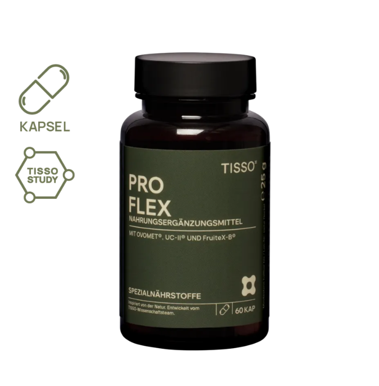 Die natürliche Hilfe bei Gelenkschmerzen: Pro Flex kombiniert natives, biologisch vollaktives Typ-II-Kollagen mit Weihrauch-Extrakt, Calciumfructoborat und Gelenknährstoffen aus Eierschalenmembran. 60 Kapseln von TISSO.