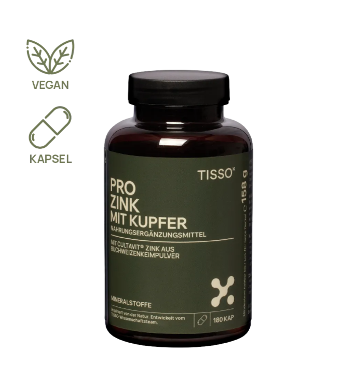 Optimal bioverfügbares Zink aus Buchweizenkeimlingen (Cultavit®) ist hier sinnvoll kombiniert mit Kupfer ‒ für ein gesundes Zink-Kupfer-Verhältnis im Körper. 180 Kapseln von TISSO.